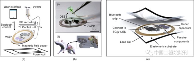 图10. 用于无线光遗传学调控的全植入式的柔性光电系统。(a)该系统包括光电刺激和传感(OESS)模块、低模量、可拉伸应变片(SG)、集成无机发光二极管(ILED)、无线控制器和电源(WCP),以及蓝牙模块和用于WPT到光电系统的感应电源线圈。(b)带有集成部件的系统制造原型(i);系统植入示意图(ii)。(c)植入式WCP模块的示意图。μ-ILED:微型无机发光二极管。(a)~(c)经Springer Nature许可,转载自文献,©2019。