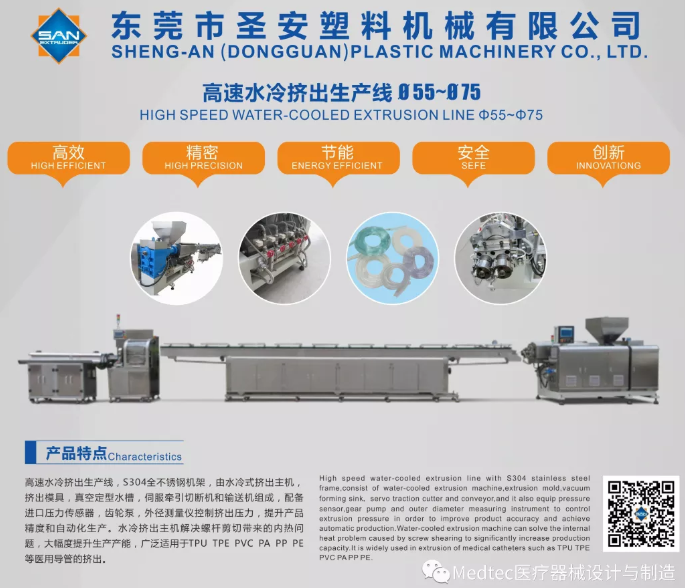 公司介绍:东莞市圣安塑料机械有限公司是专注于研发生产销售精密挤出设备的企业,经过长期的经验积累以及与原料厂家的密切配合,并结合中外最先进的技术,严格的品质管控及精密组件的批量化生产、采购,与国际同类型设备性价比更具竞争优势—“中国的价格,欧洲的品质”已经是圣安挤出设备的标识。公司拥有一支技术过硬和实践经验丰富的专业队伍,能为客户提供可靠有效的技术保障和悉知周到的工艺技术指导、培训与服务,以满足不同客户的特殊应用需求,全套设备配有先进的机电一体自动化控制系统,确保高品质和稳定持续的生产,以降低生产过程中的能耗。圣安医用挤出设备尤其在生产高透明、高弹性血透析回路、中心静脉导管、塑料管路产品时表现更优异。
