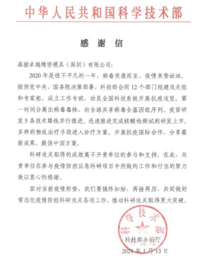 2020年,森骏集团与博奥生物共同研发并成功生产全集成核酸检测芯片,为全集成新冠检测移动实验室的建成和实行给予了科技层面极大的支持,并由此收到来自国家科技部的抗疫感谢信!
