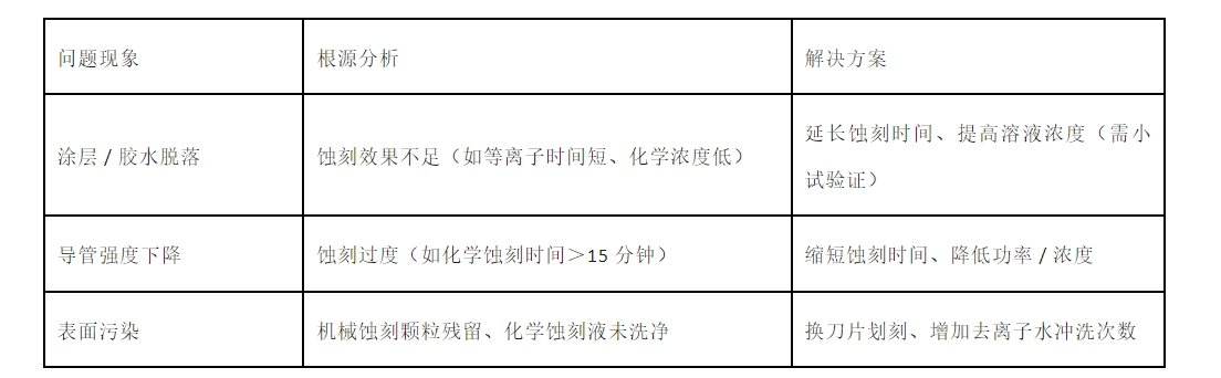 典型场景:抽吸导管的 PTFE 内衬蚀刻,用化学法处理后,层间粘结力提升 2 倍,解决脱层难题。