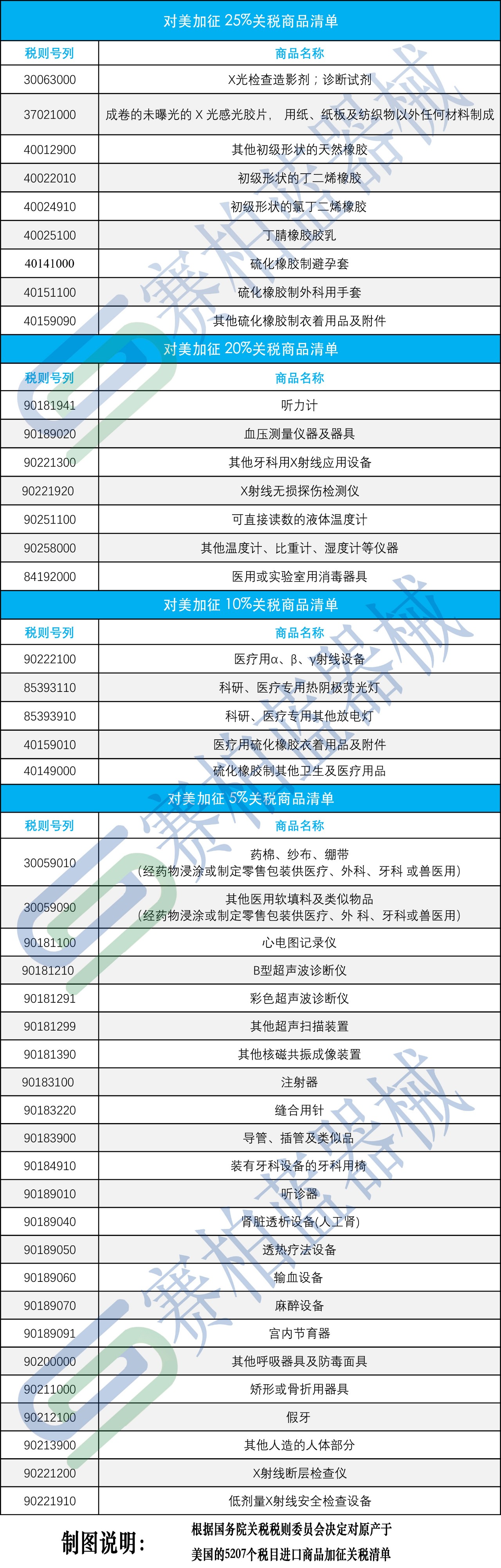 加征20%关税的商品共1078个,涉及医用或实验室用消毒器具、X射线无损探伤检测仪,以及听力计、体温计等常规医疗器械产品;