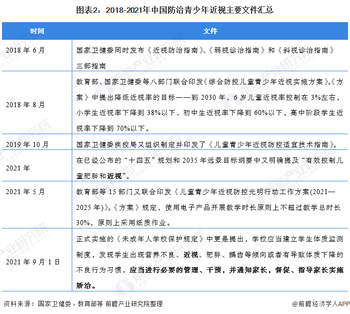 眼健康问题关系到青少年健康成长,也是关系国家未来的大问题。近年来,防控近视已经被上升成国家层面的战略。从2018年以来,国家卫健委、教育部等相关部门已经多次出台文件,聚焦防治青少年近视。