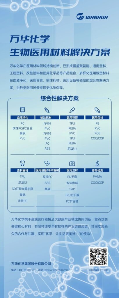 万华将医疗大健康行业作为战略性投入发展方向之一,已形成覆盖聚氨酯、通用塑料、工程塑料、改性塑料和医用化学品等组合,支撑医疗器械产业高质量发展。