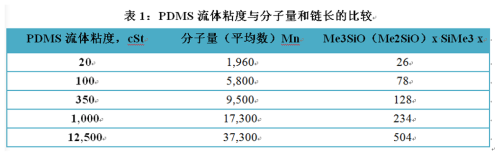 最终流体的粘度与链长直接相关,即与上式中的“ x”平均值有关,在加工/制造过程中,最终流体的粘度由产品中三甲基甲硅烷氧基单元与二甲基甲硅烷氧基单元的比率控制。任何聚二甲基硅氧烷(PDMS)流体的平均分子量可以通过执行凝胶渗透色谱法(GPC)测量。表1显示了不同流体粘度的数均分子量。