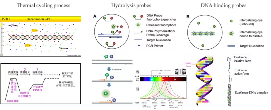 数字PCR的生化原理与实时荧光定量PCR并无明显的差异。PCR产物的鉴别均基于荧光信号的读取,不论是水解探针(例如TaqMan 探针)法还是DNA结合探针法(如SYBR Green I)均与实时荧光定量PCR类似。