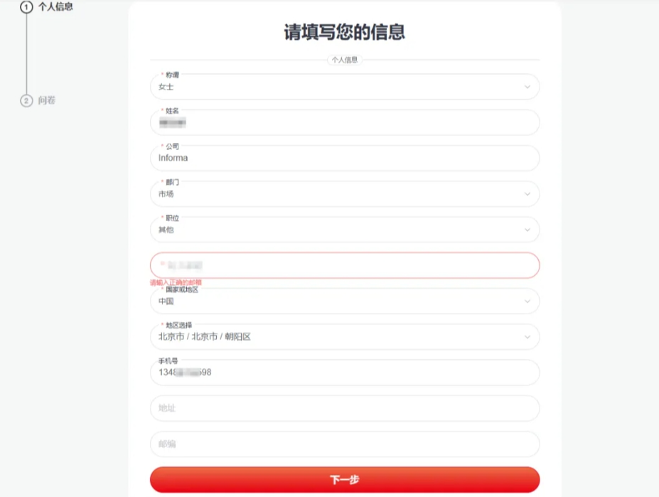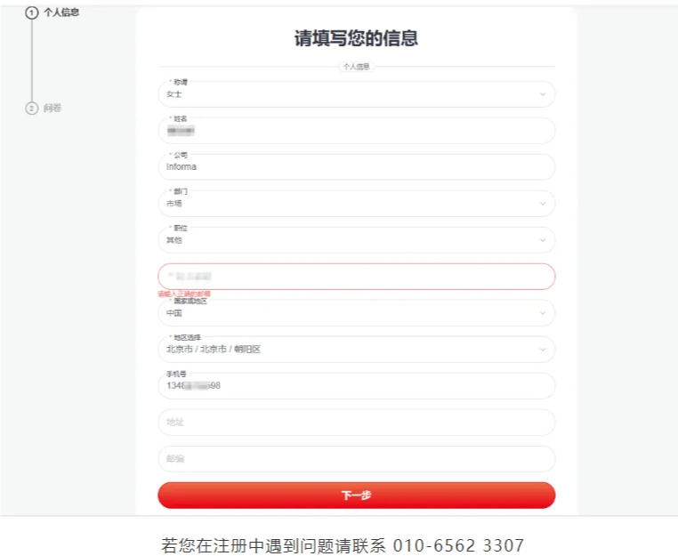 进入个人信息页后,请填写所有标*的问题,请务必保证个人信息准确,以保证在最后【身份验证】步骤和个人身份证件号对应,现场换取胸卡和享受多种服务及抽奖福利。