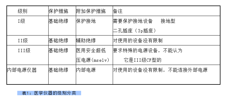 根据附加的安全措施不同,一般将医学仪器的级别分为I级、ll级、III级及内部电源仪器四类。如表1所示。
