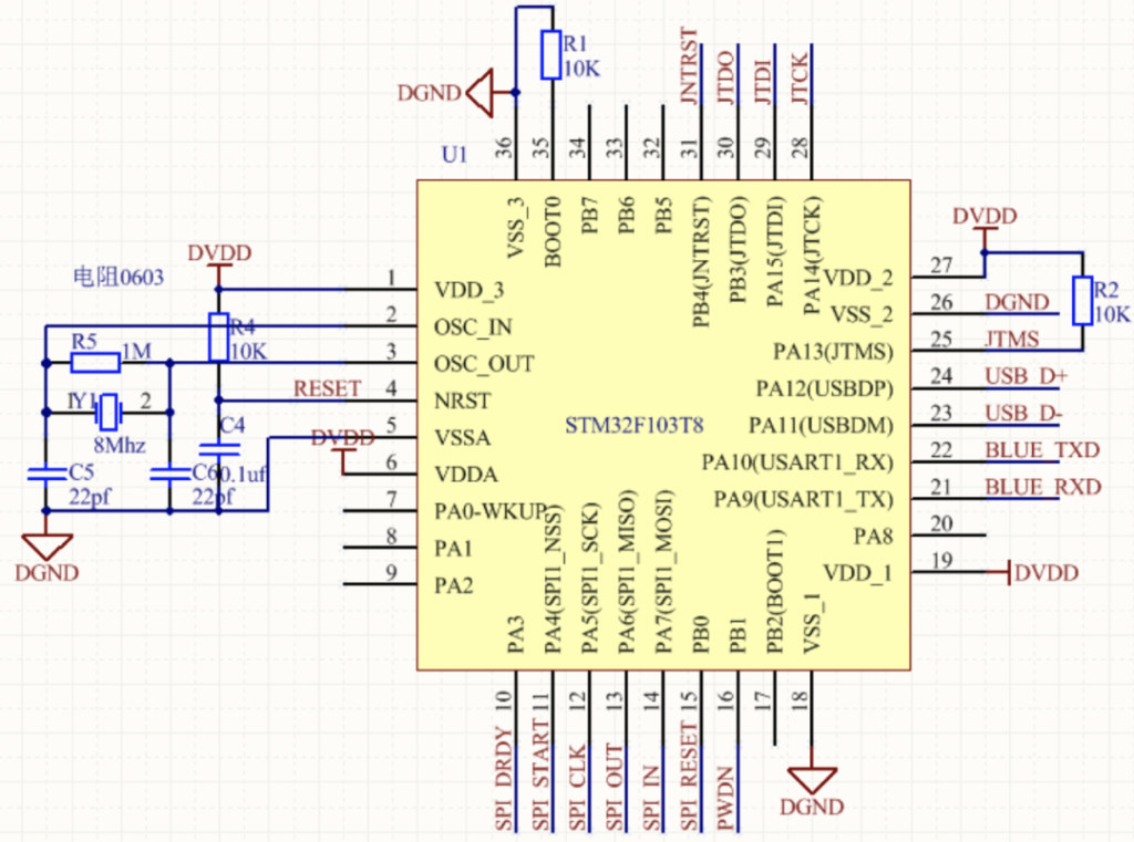 单片机控制模块以 STM32f103 为核心构建。本文设计中的单片机模块构建电路如下图,硬件上主要使用到的单片机资源有:SPI、USART 通讯接口以及控制 A/D 转换模块用到的通用 I/O 口。
