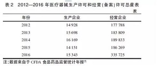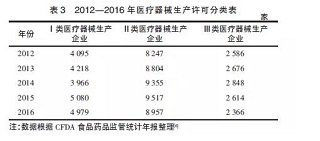 从表3中可以更深入地了解到新的政策法规实施对不同类别医疗器械生产企业的影响情况。从2012到2015年,从事第一类、第二类医疗器械生产活动的企业总体上处于增长状态。而对生产第三类医疗器械的厂家而言,2012-2014年每年都有小幅增长,但在2015、2016年均有减少。这与2015年3月国家开始要求第三类医疗器械生产企业全面执行医疗器械GMP 有直接关系,生产质量体系不合规且整改不合格的企业直接被淘汰。